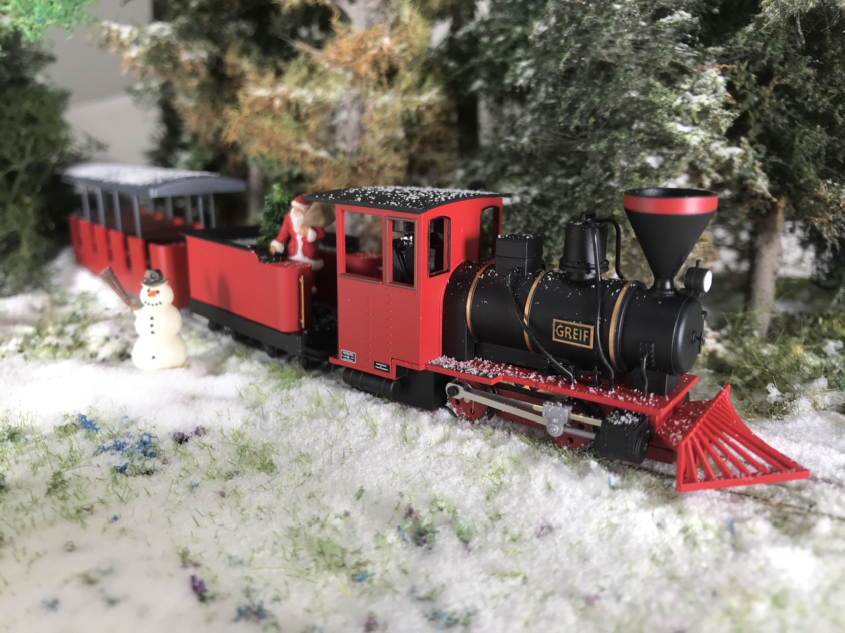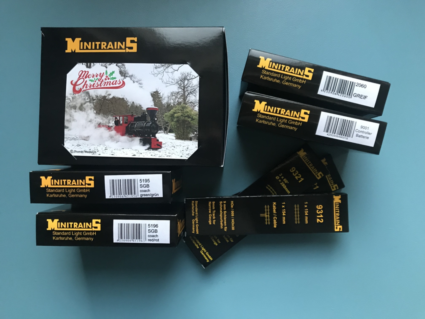 Christmas Special Set containing: 1 Locomotive Greif (2060) 1 Coach green (5195) 1 Coach red (5196) 1 Track oval (140mm radius, 6 pieces of curved track 60°, 1 straight track 154 mm, 1 connection track 154mm) 1 Controller for Battery operation (incl. 9 Volt Battery) Christmas Card available only direct through: mail@minitrains.eu Price: 270,00 Euro incl. VAT, excl. shipping cost limited availability, first come first serve. |